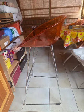 Taburete de diseño moderno con asiento en forma de óvalo. - Asiento de plástico naranja translúcido. - Patas de metal plateado