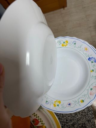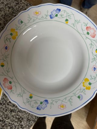 Platos de porcelana con un bonito diseño floral. -7 platos hondos, 4 planos y 5 pequeños. - Borde ondulado con ribete azul. - Decoración de flores y hojas en tonos pastel.