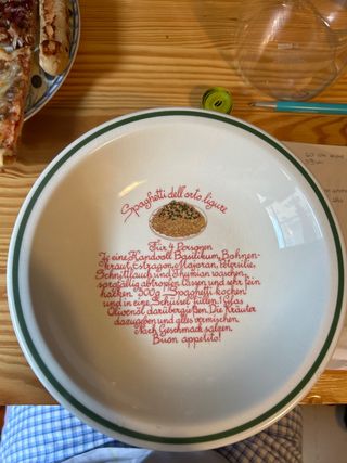 Precioso plato hondo con un diseño inspirado en la Liguria italiana, perfecto para servir pasta. - Decoración Spaghetti dell'orto ligure. - Texto en rojo con receta. - Borde verde.
