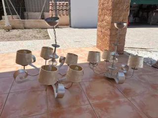 Elegantes lámparas para el salón, con un diseño moderno y sofisticado. - Acabado en color beige y plateado. - Combinación de materiales como tela, cristal y metal. - Cada lámpara cuenta con múltiples brazos y pantallas.