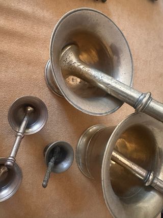 Conjunto de almireses y mano de metal, con un acabado que combina tonos dorados y plateados. - Diseño clásico y robusto. - Piezas decorativas y funcionales.
