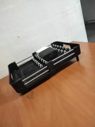 Práctico escurreplatos con diseño extensible. Parece que se ha usado porque se nota que se ha mojado pero está como nuevo. - Longitud ajustable de 33.5 cm a 50 cm. - Compartimento adicional para cubiertos o utensilios.