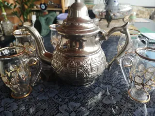 Elegante juego de tetera con seis vasos a juego, perfectos para compartir. - Tetera de metal plateado con detalles tallados. - Seis vasos de cristal transparente con adornos dorados. - Diseño intrincado en los vasos.