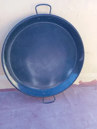 Paellera de metal con un diseño clásico y dos asas para facilitar su manejo. Su superficie es amplia y plana, ideal para preparar paellas y otros platos. - Diámetro generoso para porciones familiares. - Asas resistentes para un agarre seguro.