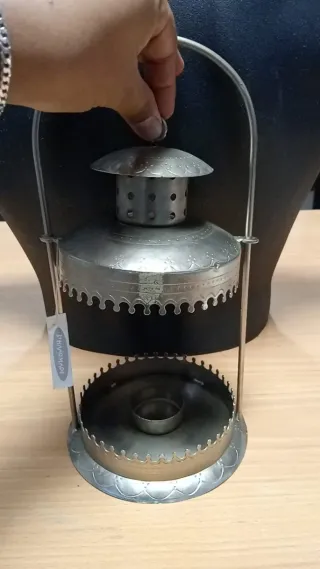 Farol decorativo de metal con un diseño intrincado. - Acabado plateado. - Asa para colgar o transportar. - Detalles grabados en la base y la tapa.