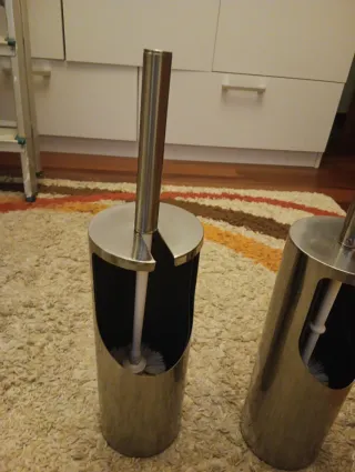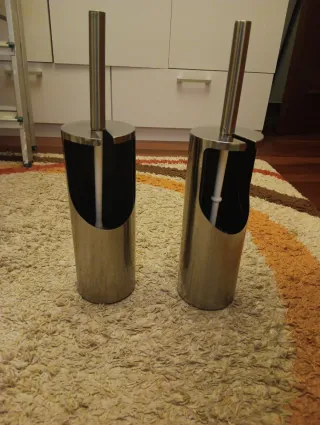Set de dos escobilleros modernos. - Diseño cilíndrico con acabado plateado. - Interior negro. - Asa de metal. - Base de plástico.