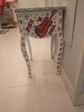 Mesita auxiliar decorada con un diseño inspirado en Amy Winehouse. Ideal para añadir un toque artístico a cualquier espacio. - Ilustración detallada de la artista. - Bordes decorados con cuentas plateadas. - Elementos gráficos como notas musicales y claquetas.