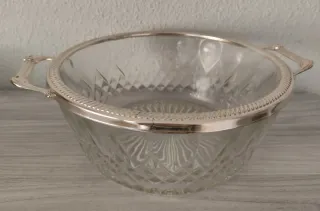 Elegante cesta con asa, elaborada en cristal tallado y base plateada. - Diseño intrincado en el cristal. - Base con detalles. - Asa con textura.