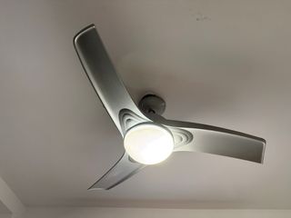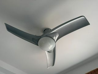Ventilador de techo con un diseño moderno y elegante. - Aspas de color negro. - Base y detalles en acabado plateado.