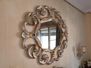 Elegante espejo con un marco de madera tallada y detalles en oro y plata. Su diseño intrincado añade un toque de sofisticación a cualquier espacio. - Marco con motivos ornamentales. - Acabado bicolor: oro y plata.