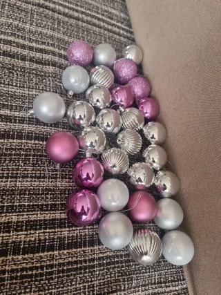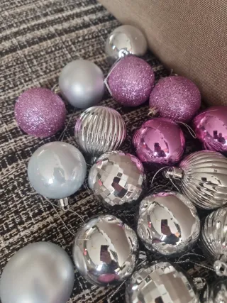 Conjunto de 30 adornos para el árbol de Navidad. - Bolas de diferentes acabados: lisas, brillantes y con relieve. - Tonos rosas y plateados que combinan fácilmente. - Ideales para crear un ambiente festivo.