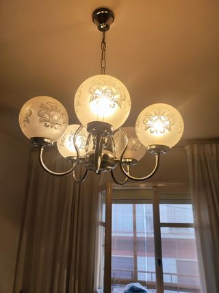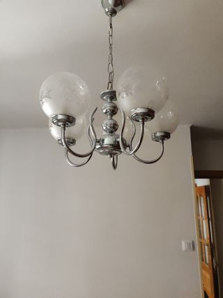 Bonita Lámpara plateada, con 5 focos de cristal tallado, en perfecto estado.