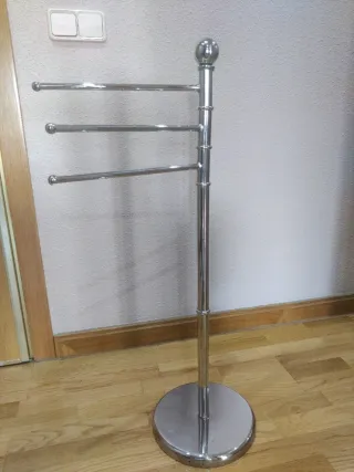 Elegante toallero de pie con un diseño moderno y funcional. Perfecto para organizar tus toallas en el baño o cualquier estancia. - Base redonda y estable. - Tres barras para colgar. - Acabado brillante.