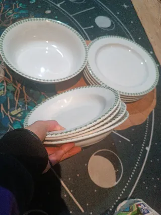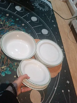 Conjunto de vajilla de cerámica con un bonito borde decorativo. Recoger en Donostia, Egia. - Un bol grande. - 4 platos llanos. - 4 platos hondos.
