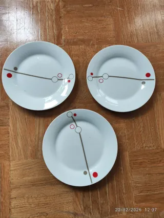 Conjunto de tres platos de postre con un diseño moderno y elegante. Perfectos para añadir un toque de estilo a tu mesa. - Fabricados en porcelana. - Decoración con líneas y círculos en tonos marrones y rojos. -Modelo EDNA. - Fabricante Della Casa. Tengo más cosas en mi perfil.