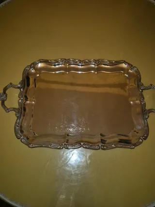 Bandeja de metal plateada con asas