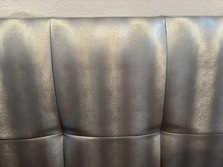 Cabecero de polipiel en color plata. Presenta algunos arañazos causados por mascotas.Se puede RESTAURAR. - Diseño capitoné con botones. - Acabado brillante.