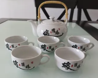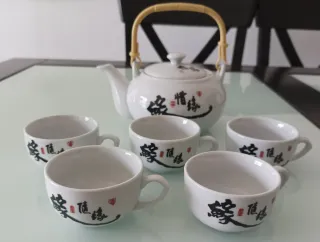 Conjunto de té con tetera y tazas. - Diseño con caligrafía oriental.