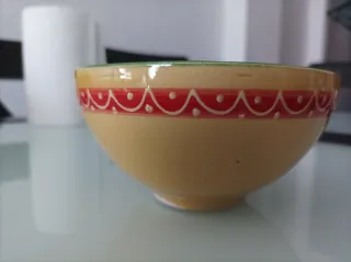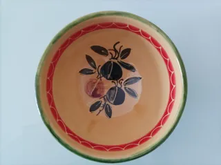 Bonito cuenco de cerámica con un diseño en su interior. - Diseño central de frutas y hojas. - Borde decorado con motivos rojos y verdes.