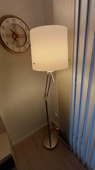 Lámpara de pie con un diseño moderno y elegante, ideal para dar luz a tu salón o cualquier estancia. - Estructura principal en metal plateado. - Dos puntos de luz, uno principal y otro auxiliar. - Base redonda para mayor estabilidad. Funciona bien, aunque le falta un pequeño tornillo y no esta muy estable la luz superior, pero si no lo tocas va bien. La luz es regulable, lleva las bombillas. Lo tendré un par de días o lo llevo al punto limpio, si viene alguien perfecto. Si no, al punto limpio.