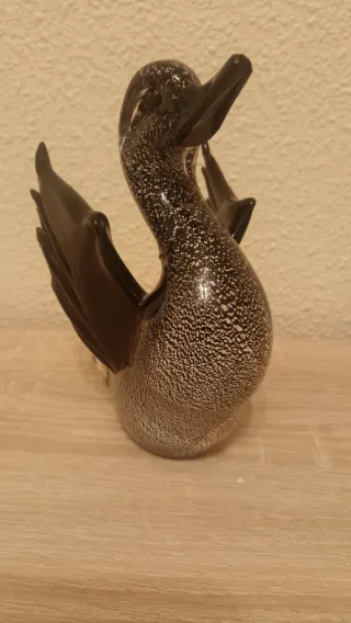 Figura decorativa de pájaro con un diseño elegante y llamativo. Medidas: alto 17, ancho 13 - Elaborado en cristal de Murano. - Acabado en tonos negro y plateado con detalles salpicados.