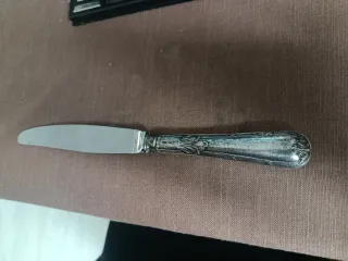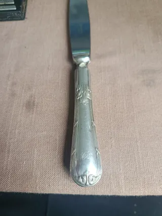 Elegante cuchillo de plata de ley peso 70 gramos con un diseño clásico y detalles ornamentales en el mango. Perfecto para añadir un toque de distinción a tu mesa. - Fabricado en plata de ley. 70 gramos - Presenta grabados decorativos en el mango.