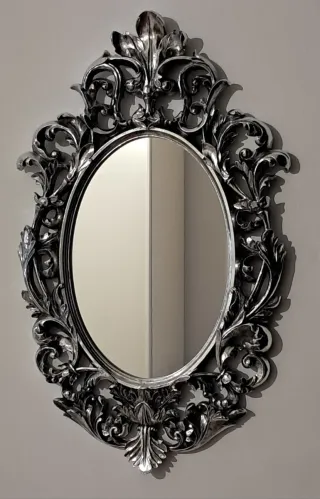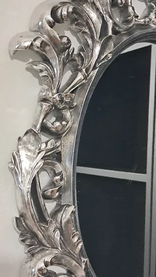 Elegante espejo decorativo con un marco ornamentado. - Forma ovalada. - Marco con detalles intrincados. - Acabado en tono plateado. 50x30 cm
