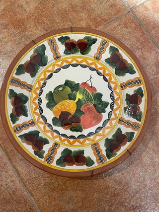 Plato decorativo para colgar en la pared con un diseño de frutas y frutos secos. 30 cm de diámetro - Motivo central de frutas variadas. - Borde decorado con motivos de frutos secos. - Pieza de cerámica pintada a mano.