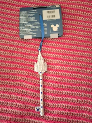 Este adorno con forma de llave presenta un diseño inspirado en un castillo. - Detalles en color azul. - Acabado metálico plateado.