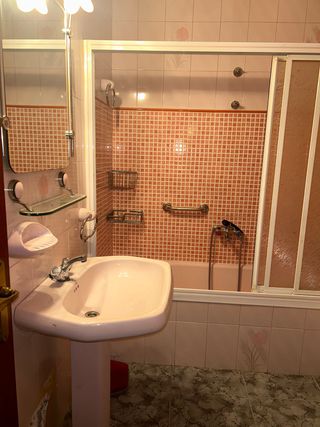 Conjunto de baño completo en tonos rosa y plata. - Lavabo de cerámica con pedestal. - Grifería de metal. - Plato de ducha con mampara de cristal y metal. - Accesorios de plástico y metal.