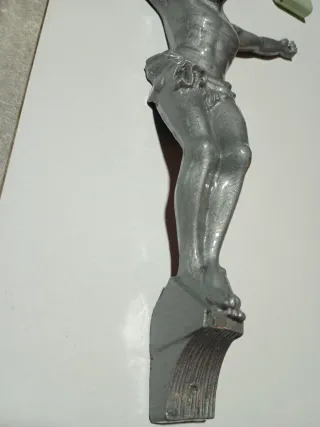 Adorno de Cristo crucificado con acabado plateado, metálico en plomo sin roturas ni golpes,mide 29x19 centímetros y 339 gr. Hago envíos