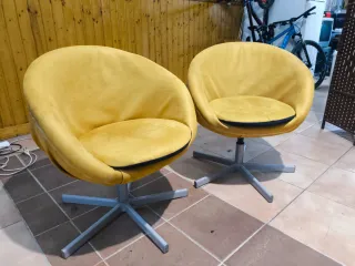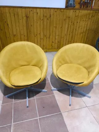 Conjunto de dos sillones modernos y cómodos. - Diseño giratorio para mayor versatilidad. - Tapicería en tela de color amarillo vibrante. - Base metálica plateada robusta. (22€ cada uno)
