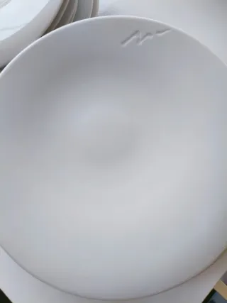 Elegante vajilla de porcelana diseñada por Ferran Adrià de la marca Ola. Un toque de distinción para tu mesa. - Diseño minimalista y moderno. - Acabado liso y suave al tacto. - 6 platos llanos y 6 platos hondos. No tiene caja original.