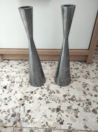 Elegantes portavelas con un diseño moderno y estilizado. Añaden un toque de sofisticación a cualquier espacio. - Forma cónica con un estrechamiento central. - Acabado brillante. - Base estable. Los dos 20€. Uno, 10€.
