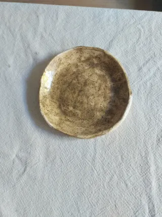 Pequeño plato de cerámica con un diseño orgánico y un acabado rústico. Su tonalidad beige y marrón le da un aspecto natural y cálido. Hecho a mano. Diseño original. Uso decorativo/culinario.