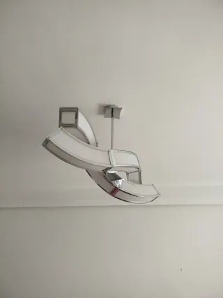 Elegante lámpara de techo con un diseño moderno y llamativo. Combina a la perfección con cualquier estilo de decoración. (Valorada en 600€) - Acabado en plata y blanco. - Estructura de metal y detalles en cristal.