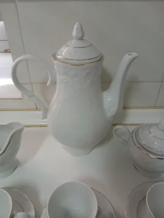 Elegante juego de café con detalles dorados. - Tazas y platillos de porcelana. - Jarra de café. - Lechera. - Azucarero.