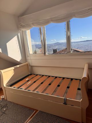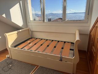 Cama nido de madera maciza con medidas de 105x190 cm. - Estructura robusta. - Diseño elegante. Hay que colar los soportes del somier superior. Se regala colchón de la cama nido inferior. Incluye dos somieres
