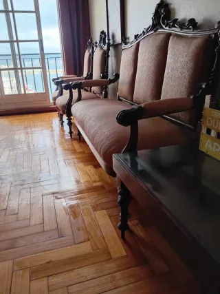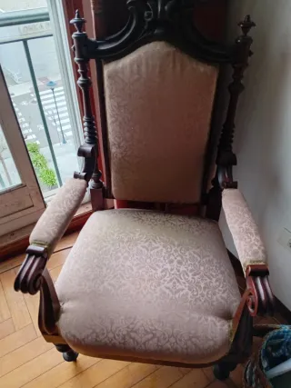 Elegantes sillónes sillas y tresillo de epoca de 1910 con estructura de madera caoba oscura y tapicería en tonos beige.Dos sillo es.cuatro sillas y un tresillo. - Diseño clásico y ornamentado. - Asiento y respaldo confortables. - Brazos acolchados. _buen estado sin carcoma -de principios de siglo 1905 -todos por 250 €