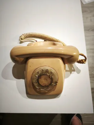 Teléfono fijo de estilo vintage con dial giratorio. - Diseño clásico en color beige. - Cable en espiral. - Marcación por disco.