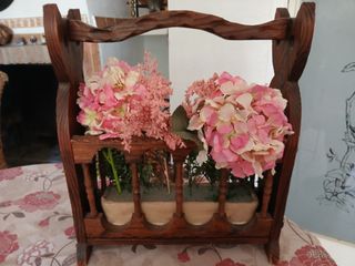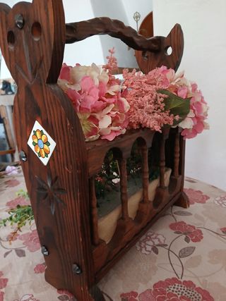 Elegante revistero de madera con un bonito arreglo de flores artificiales en tonos rosas y blancos. Añade un toque decorativo a cualquier espacio. - Diseño de madera. - Flores artificiales incluidas. Medidas:49 alto 40 ancho 14 fondo