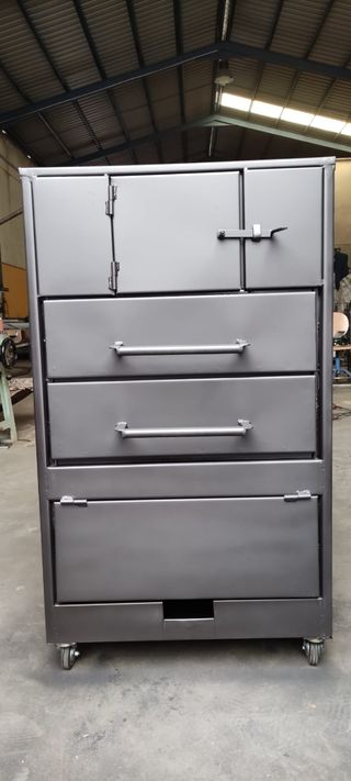 Horno asador de patatas con un diseño robusto y funcional. - Construcción en metal. - Acabado en color gris. - Equipado con ruedas para facilitar su movilidad.