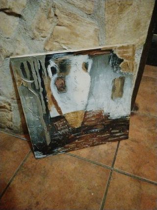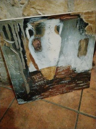 Cuadro con un diseño abstracto que combina elementos de piedra y madera. - Tonos dorados y blancos predominantes. - Texturas variadas para un acabado único.