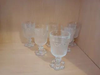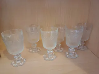 Set de seis copas de cristal con un diseño delicado y elegante. - Cada copa presenta un tallado intrincado. - Base con detalle floral. - Ideales para cualquier ocasión especial.