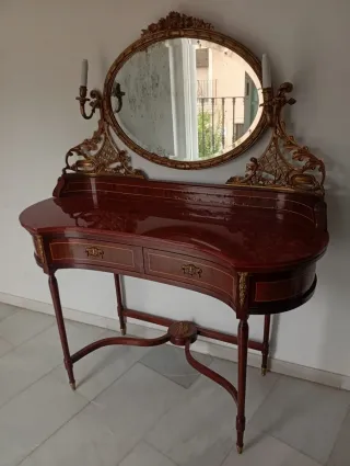 Elegante tocador de estilo antiguo con un espejo ovalado y dos candelabros dorados. - Encimera de madera oscura con detalles dorados. - Dos cajones con tiradores ornamentados. - Patas curvas con detalles dorados. - Espejo con marco ornamentado.