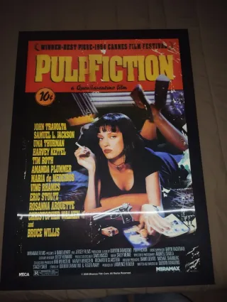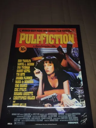 Póster de la icónica película Pulp Fiction. - Diseño con efecto 3D. - Presenta el elenco principal y detalles del film.