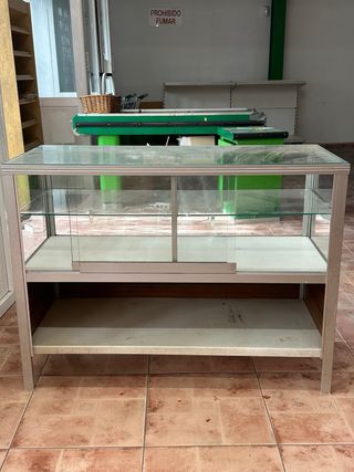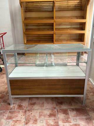 Mostrador con estructura metálica y detalles en madera. - Superficie de cristal. - Base de madera con acabado veteado. - Patas metálicas resistentes.