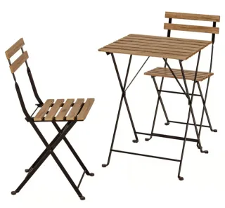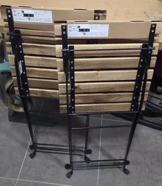 Conjunto de mesa y dos sillas de jardín plegables, perfectas para espacios exteriores. Nunca usadas. Aún con sus embalajes. - Diseño con estructura metálica y asientos de madera. - Fácil de plegar y almacenar.