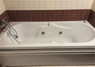 Bañera de hidromasaje con capacidad para dos personas. Sus dimensiones son 170 cm de largo por 75 cm de ancho. - Seis chorros de hidromasaje. - Fabricada en acrílico de alta calidad. - Color blanco. - Reduce el estrés y las sobrecargas musculares. - Diseño moderno y cómodo. - En perfecto estado, sin ningún uso.