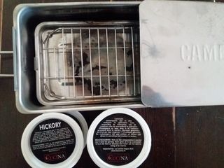 Ahumador de acero inoxidable de la marca Camerons, ideal para dar un toque ahumado a tus comidas. Incluye tres botes de virutas. Compatible con cocinas de inducción. Poco uso. - Ahumador de metal. - Dos botes de virutas: Hickory y Oak. - Asa plegable para facilitar el transporte.